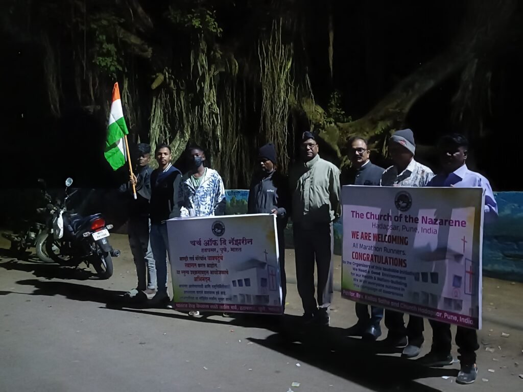 The Church of the Nazarene, Hadapsar, welcomes and congratulates marathon runners for running for a healthy environment cause. It is early morning. The church is involved in this program with local non-Christian organizations in Pune, India.