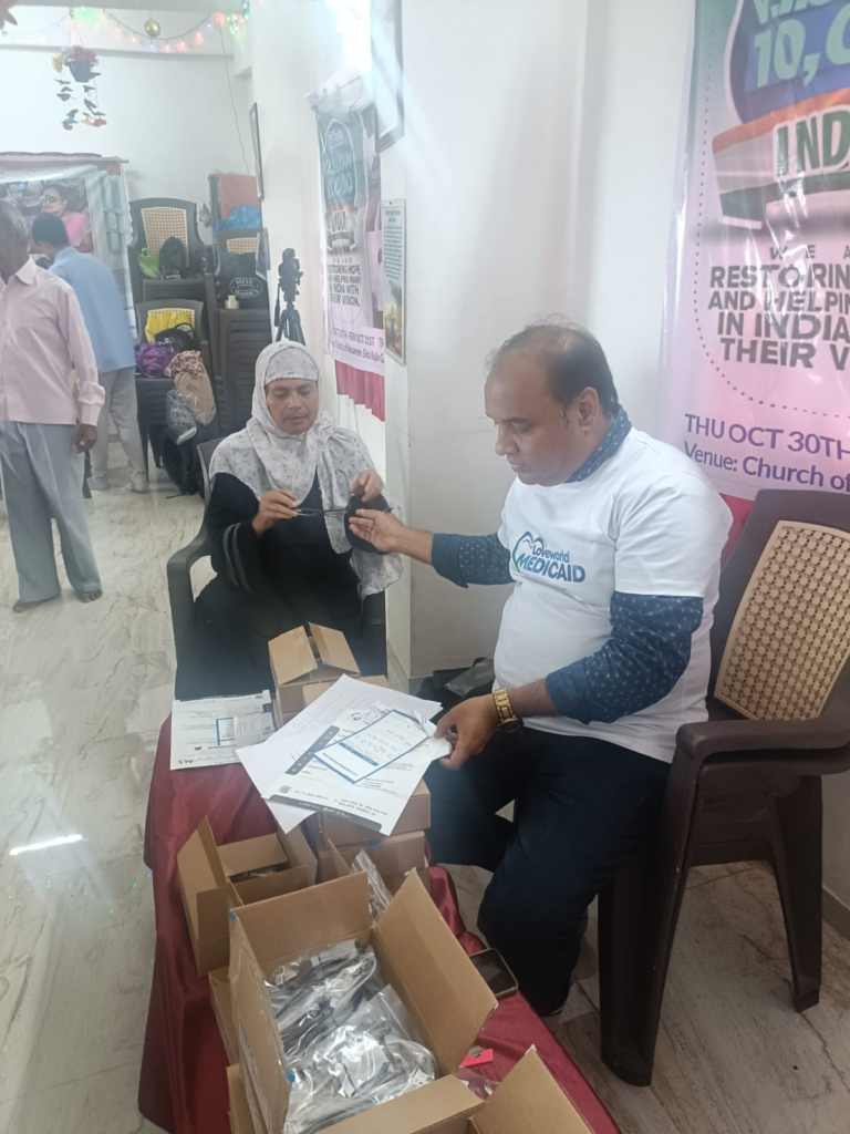 Eye-checking camp: people gathered in the church for eye checks.